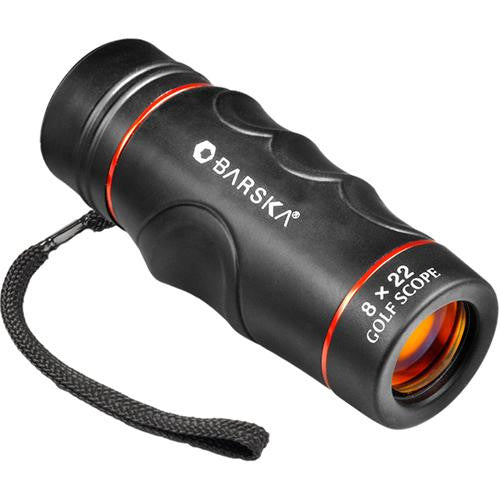 8x22 WP Golf Scope Estimate the range to the pin with internal distance reticle, Ruby coated optics, 100% Waterproof, Range: 50-200 yards, Leatherette pouch and wrist strap included.