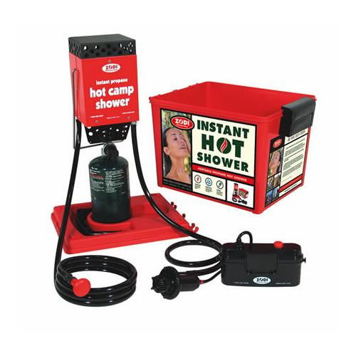 Equipped with a stainless steel burner, this Zodi shower provides endless hot water in just seconds. Includes a powerful battery-powered water pump and a rugged plastic storage case that doubles as a 4-gallon water container and propane tank base. Ideal for family camping, emergencies, RVs and more. (Propane & 4 D-cell batteries not included.)