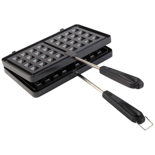 Coleman's Waffle Iron easily makes two 4" x 4.5" waffles, and it can be used over either a stove or a campfire. This waffle iron features cast aluminum material that has a non stick finish, making it easy to clean, and its locking handle means you can multi-task as your waffles cook.